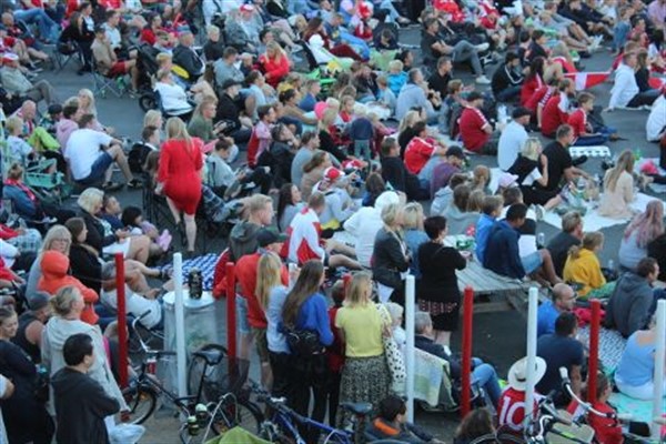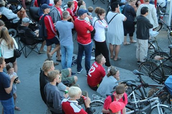 Hvad gør man når far og mor også vil se bold? Jo de tager børnene med, men disse små piger til venstre i billedet, så ikke meget. Det kunne de heller ikke. Det varede vist ikke længe før barnet i barnevognen til højre faldt i søvn, mens det så sværere ud med hende som far havde på armen. -