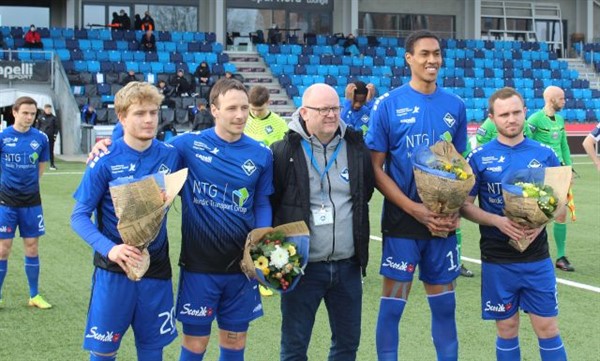 Direktør Per Rud er her flankeret af debutanterne i første kamp af sæsonen: Fra venstre er det Emilio Simonsen, Mike Jensen, Mikkel Qvist og Lasse Petry. -