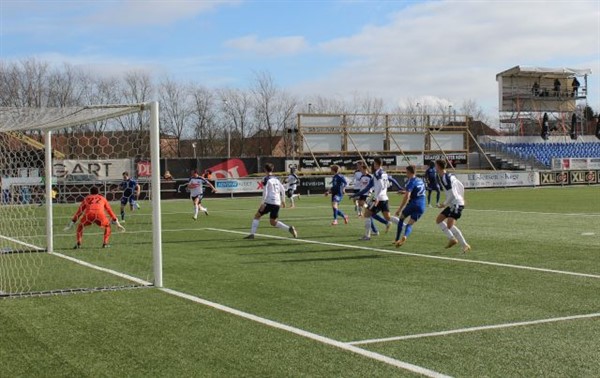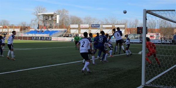 Her har Qvst ramt bolden som svæver mod fjerneste målhjørne. Modstanderne håber på den rammer stolpen, mens Qvist håber den går i mål. -