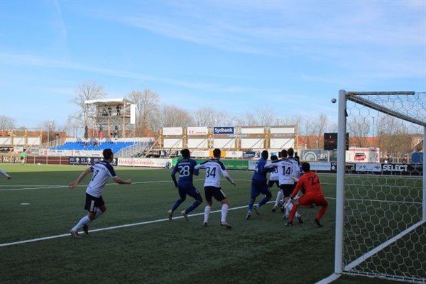 HB Køge er blevet farligere på dødbolde efter Mikkel Qvist er kommet til som kan kaste bolden ind i straffesparksfeltet. Her er det et hjørnespark som dog bliver clearet af en Vendsyssel FF forsvarer i første halvleg. -