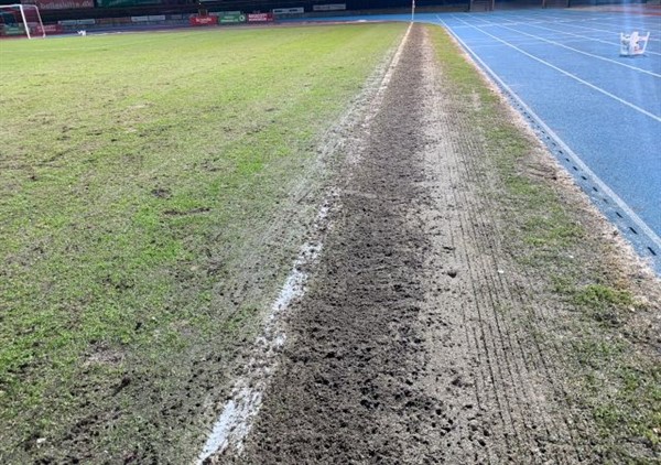 Ikke bare på banen, men også lige udenfor er Hvidovres bane i en elendig forfatning. Her har linjedommeren løbet den ene halvdel af banen op efter de første 45 minutter. -