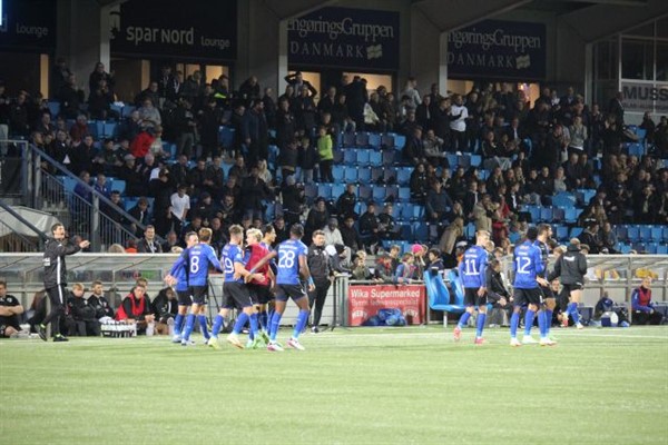 Marius Elvius løber hen mod FC Fredericias bæk for at juble, og træner Michael Hansen nedværdiger dem ikke et blik. -
