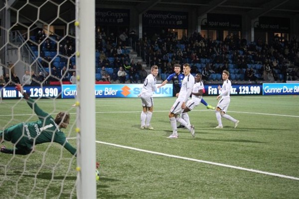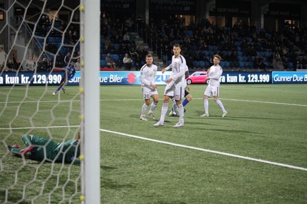 ... og flæskede så bolden ind fra kanten af feltet. Uden chance for målmand Alexander Nybo -