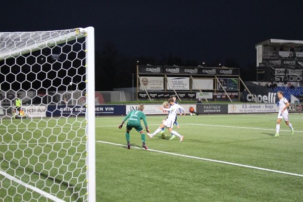 FC Fredericia blev generelt godt lukket ned af HB Køge holdet, men enkelte chancer havde de. Her skyder de snært forbi, og målmand Snorre havde ikke haft en chance hvis bolden var indenfor rammen. -