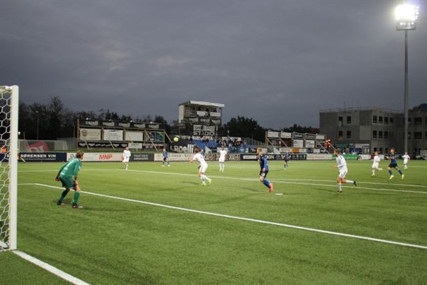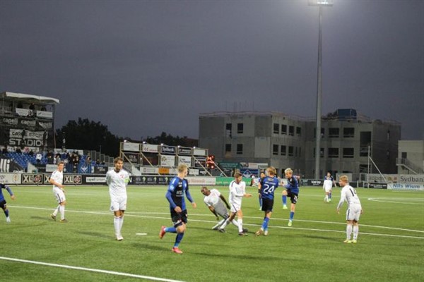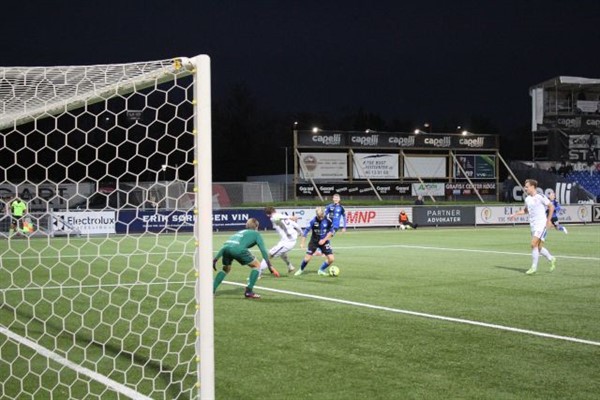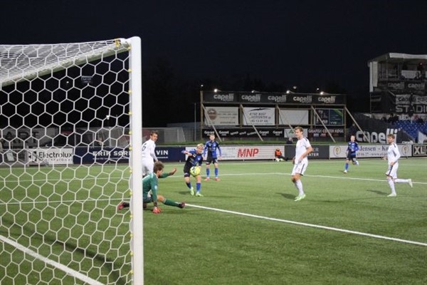 Trods omringet af fire forsvarsspillere, finder Marius Elvius hullet mellem dem, og skyder hårdt og tørt mod fjerneste stolpe. Denne gang når målmand Nybo ikke bolden og må se den går ind. -