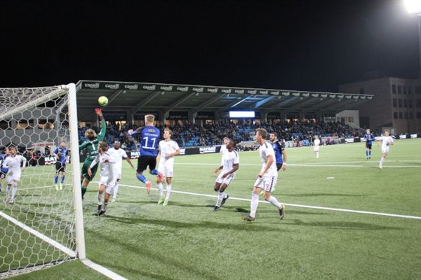 Nemanja Cavnic har her søgt første stolpe, men bolden flyver over ham og bliver clearet af FC Fredericia forsvaret. -